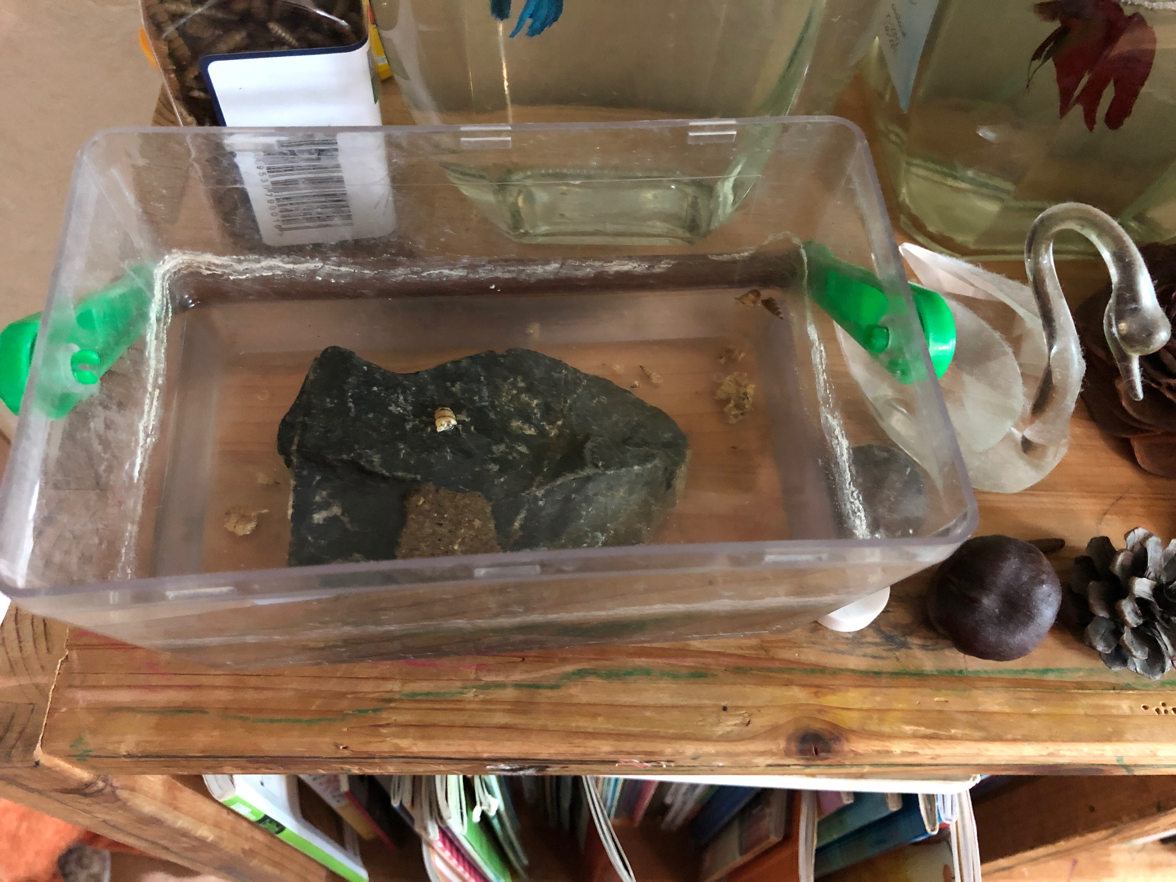 용용이는 제가 살던 작은 집이 올려져있는 낮은 나무 책장 뒤쪽에 떨어졌던 모양이다.