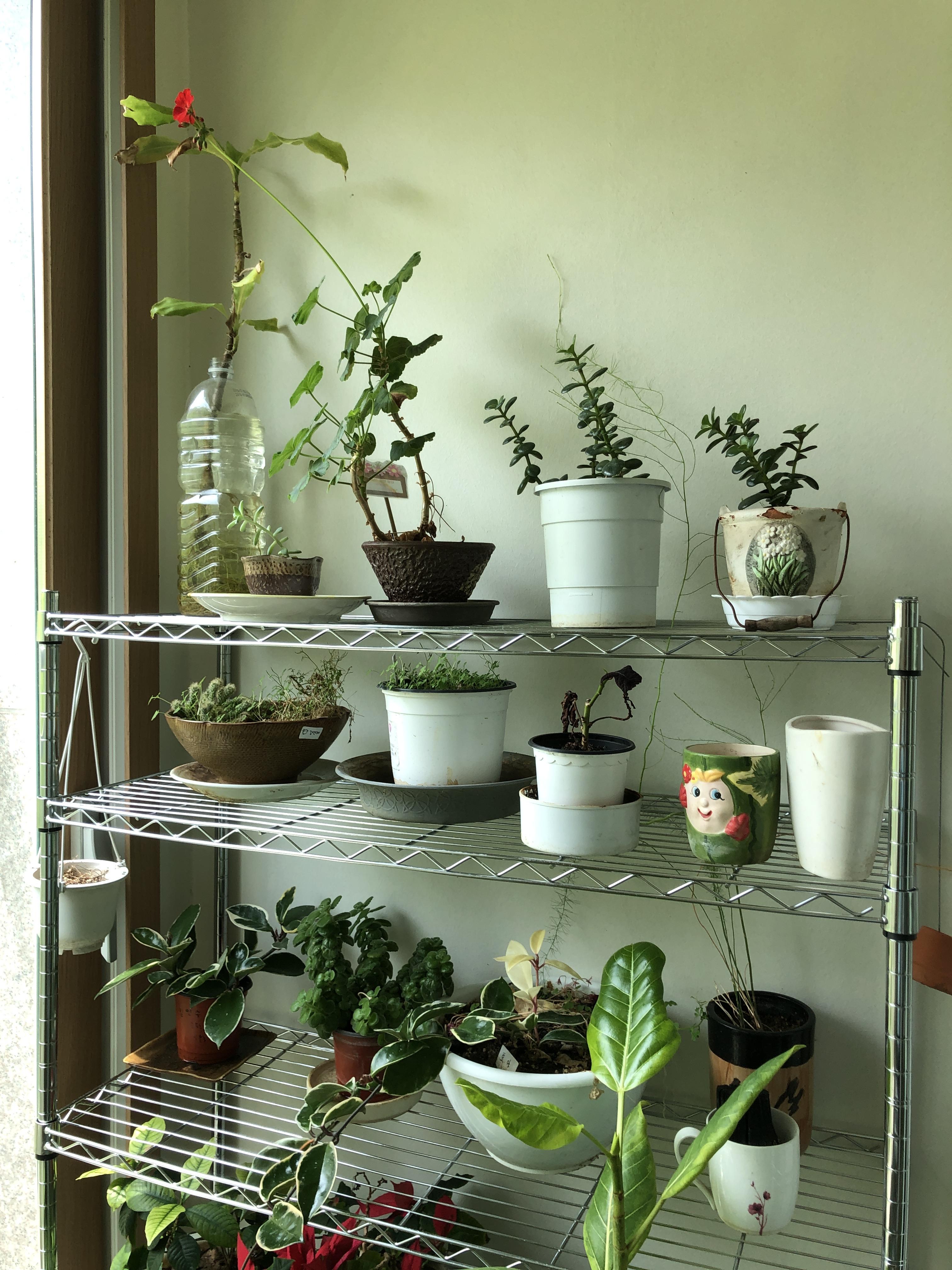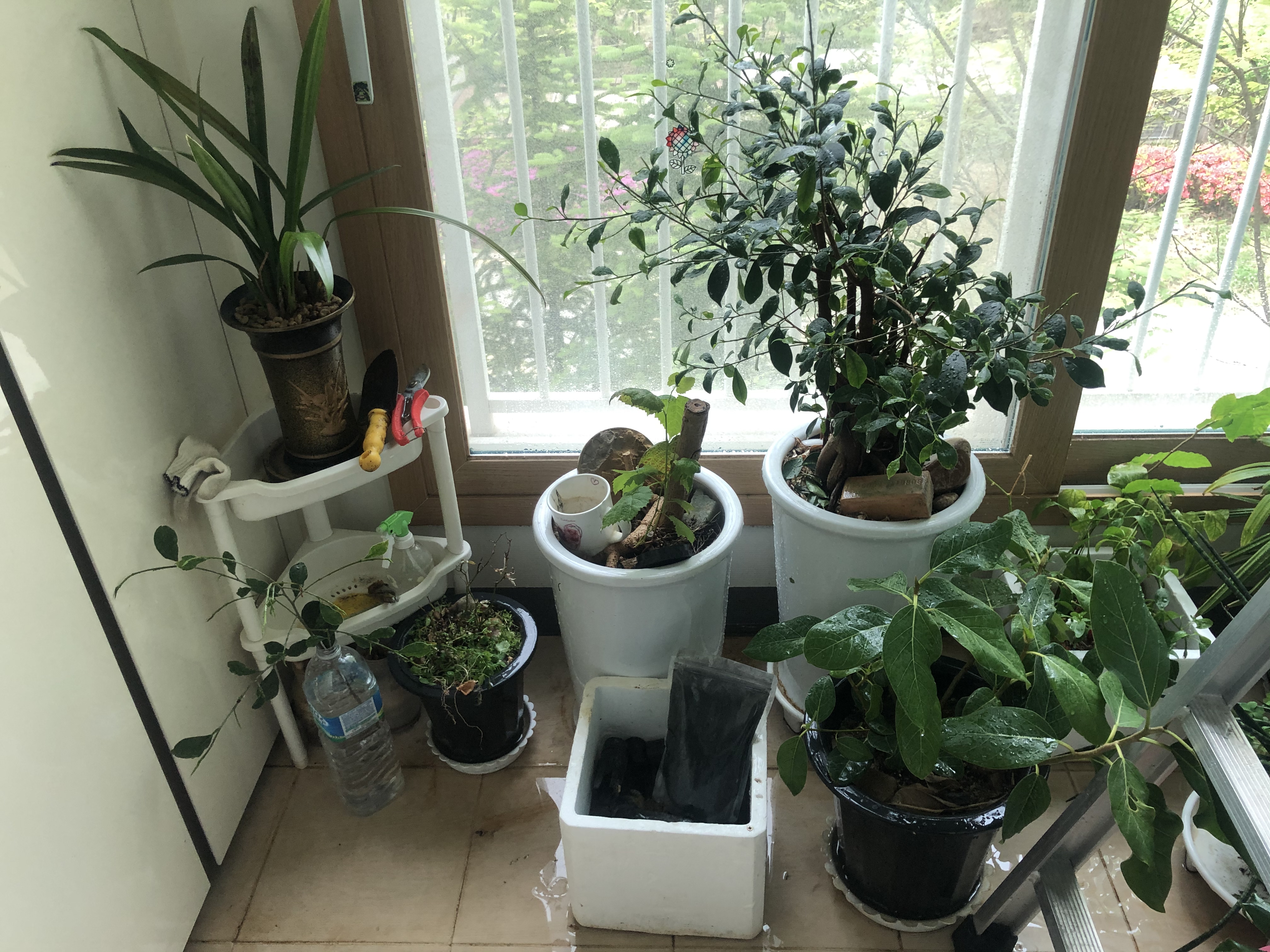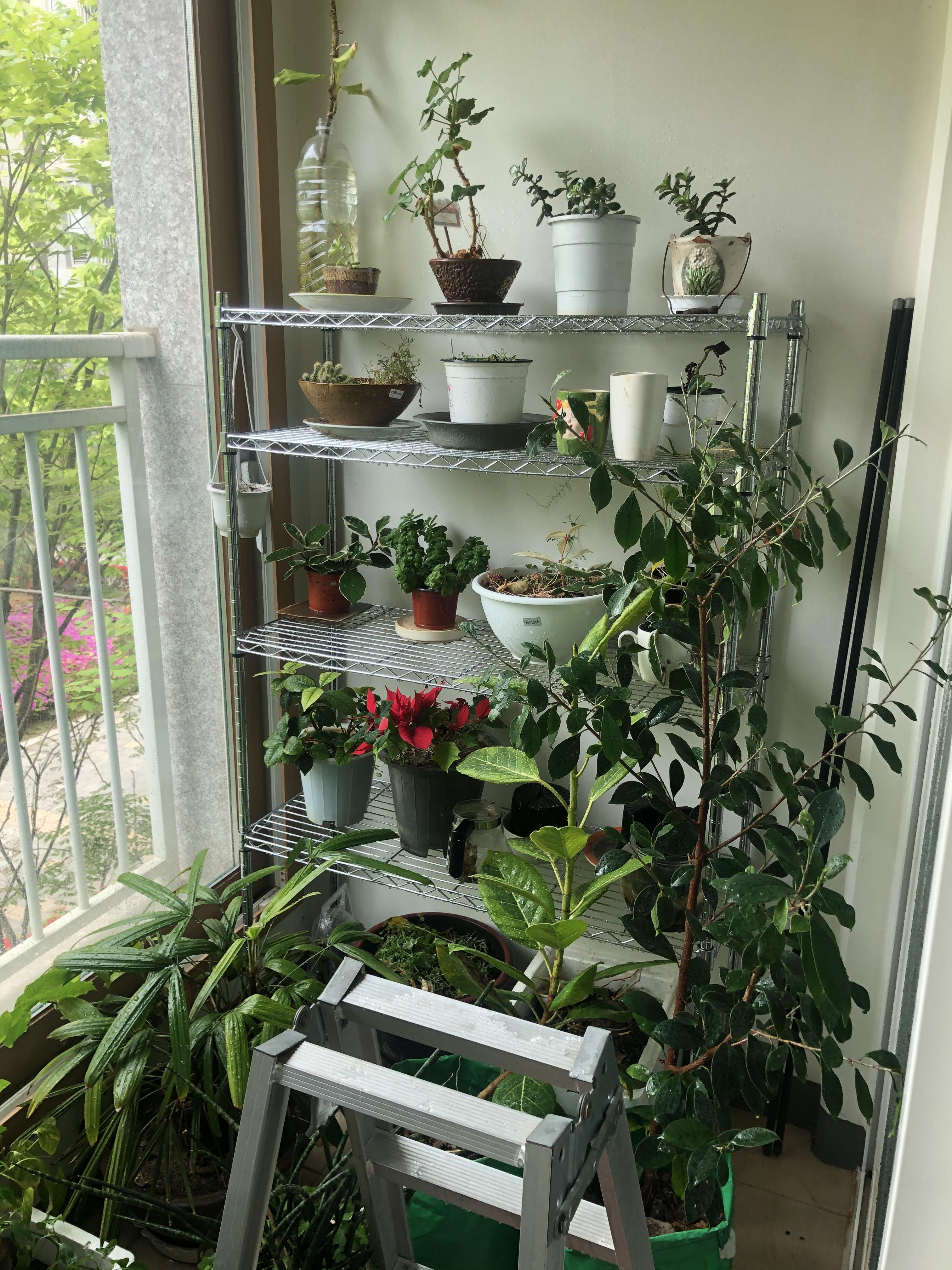 4월에 오랫동안 벼르던 안방베란다 화분 정리를 했다. 선반을 설치해서 작은 화분들을 올려두고, 큰 화분들 사이를 조금씩 띄워주었다. 크고 작은 화분들이 모두 한번씩 움직이는 동안 바닥 타일도 오랫만에 깨끗하게 물청소를 해주었다. 원체 화분이 많아서 정리를 해도 베란다에 자리가 많아지지는 않았다. 여전히 발디디기가 쉽지않지만 그래도 화분들 끼리는 조금 여유롭게 자리를 벌리고 지낼 수 있어서 좋은 것 같다. 5월에 친정에 다녀올때 키가 엄청 커버린 인삼벤자민 아기의 줄기를 가지치기해서 부모님께 갖다드렸다. 뿌리가 잘 나서 잘 자랄 수 있을지.. 부모님은 워낙 화초와 나무를 잘 키우시니까 인삼벤자민도 강릉에서 새롭게 잘 뿌리내리고 지내주기를. 처음 우리집에 왔던 엄마인삼벤자민도 올봄에 가지가 많이 무성해져서 그중 큰 가지 하나를 잘라 물화분에 넣어두었다. 뿌리가 조금 생기면 흙화분에 옮겨심어봐야겠다. 잎이 좀 떨어져서 죽으려나.. 걱정되기도 하는데 5월중에 어서 흙을 마련해서 심어줘야겠다. 작은 화분들은 선반으로 이사한후 다들 조금씩 안정감있게 자라주는 것 같다. 부지런한 쟈스민은 또 꽃송이를 피워올렸고, 아스파라거스는 선반의 철망 사이로 가늘고 긴 줄기를 무럭무럭 키워올리고 있다. 머리카락같은 아스파라거스를 요리해 먹어봐야할텐데... 어떤 요리에 넣지? 그냥 데쳐서 쌈장찍어 먹으면 되나..